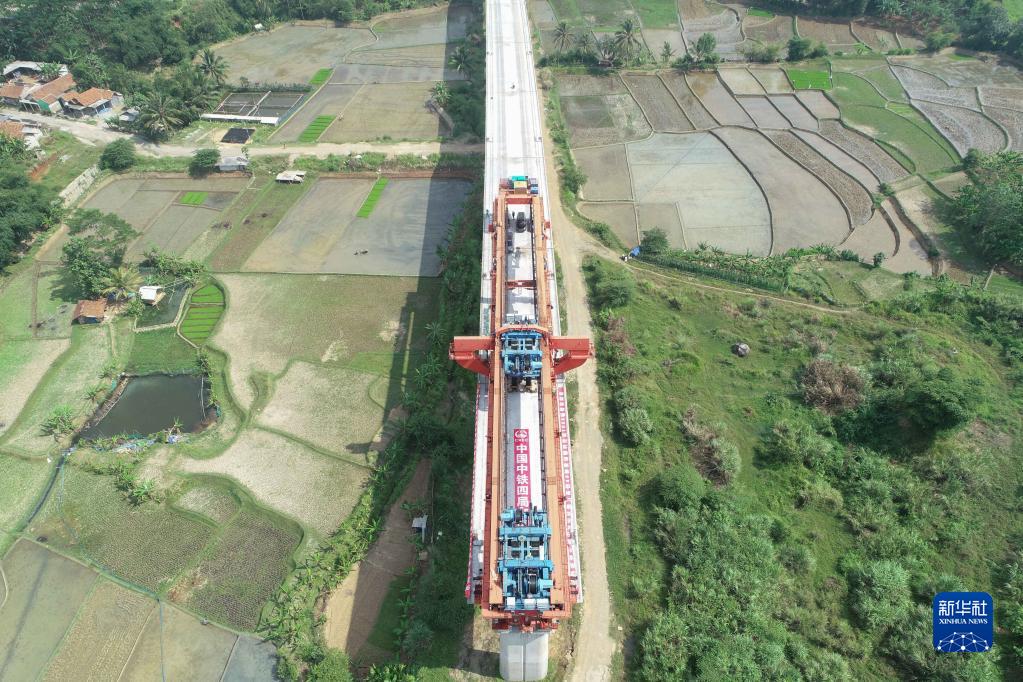 印尼雅萬(wàn)高鐵4號梁場(chǎng)最后一榀箱梁7日精準落梁對位,提前8天完成全部1066榀箱梁預制和架設任務(wù),為2023年6月建成通車(chē)奠定基礎。新華社發(fā)(王增堃 攝)