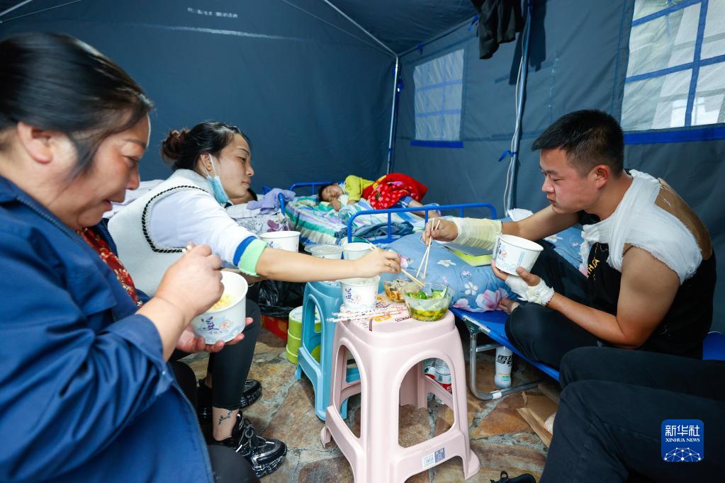 9月7日,在瀘定縣磨西鎮的地震災后安置點(diǎn),人們在吃飯。