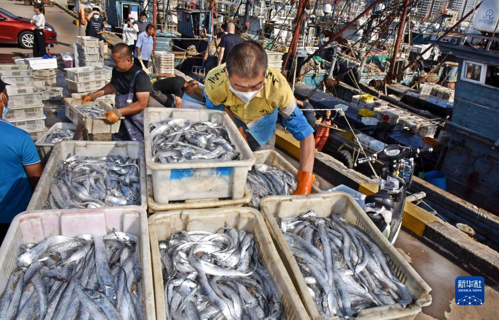 9月7日,在青島西海岸新區積米崖漁港碼頭,一位前來(lái)進(jìn)貨的魚(yú)販正在裝車(chē)。 新華社記者 李紫恒 攝