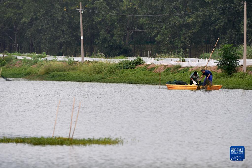 9月8日,在五河縣沱湖鄉大崗村大閘蟹養殖基地,當地農戶(hù)在捕撈大閘蟹。