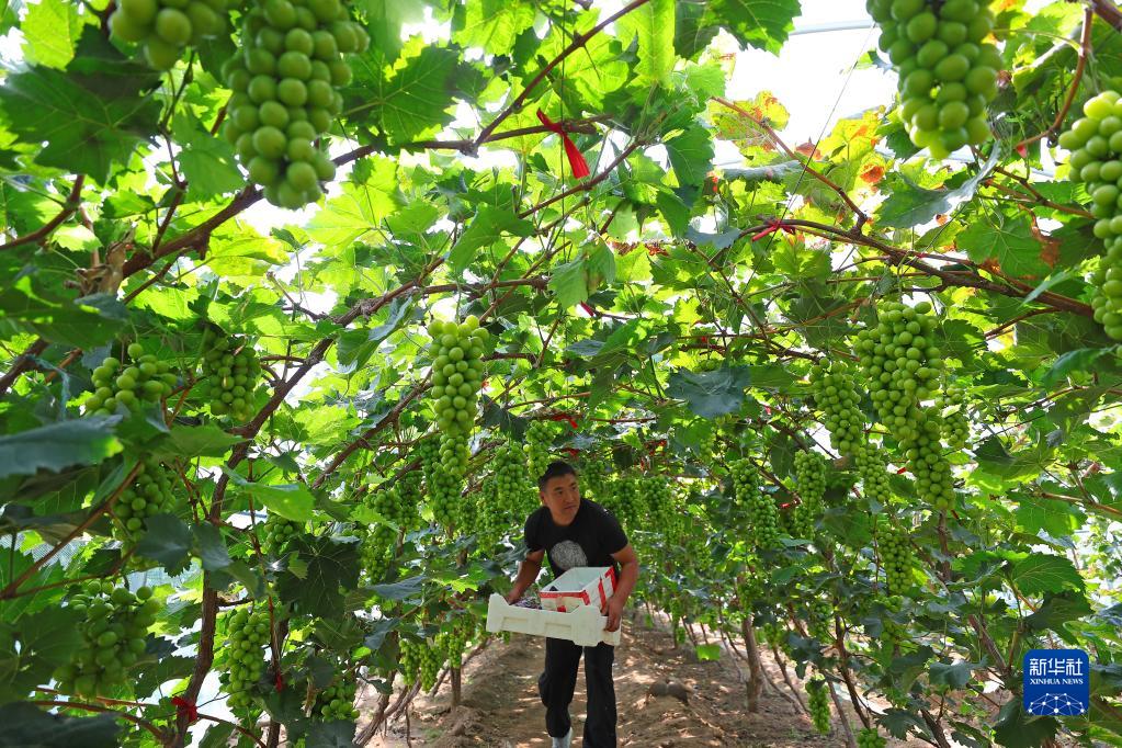 9月6日,在丁家房鎮大蛇山子村,果農在大棚里準備采摘葡萄。