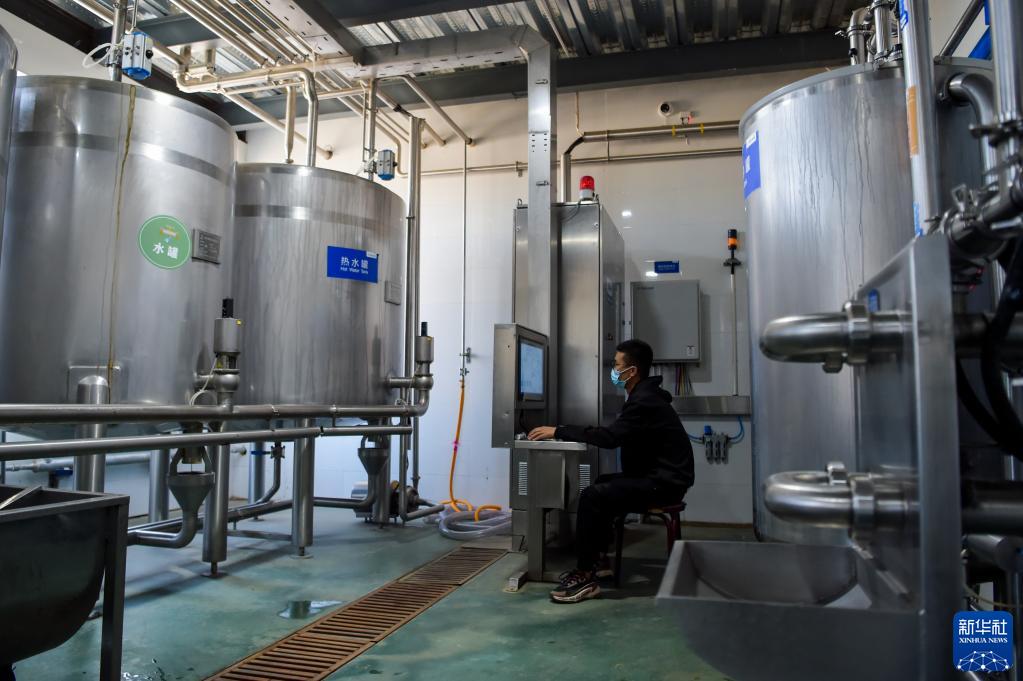 9月7日,在位于托克托縣的內蒙古恒富牧業(yè)第三牧場(chǎng),工人在查看擠奶設備運行情況。