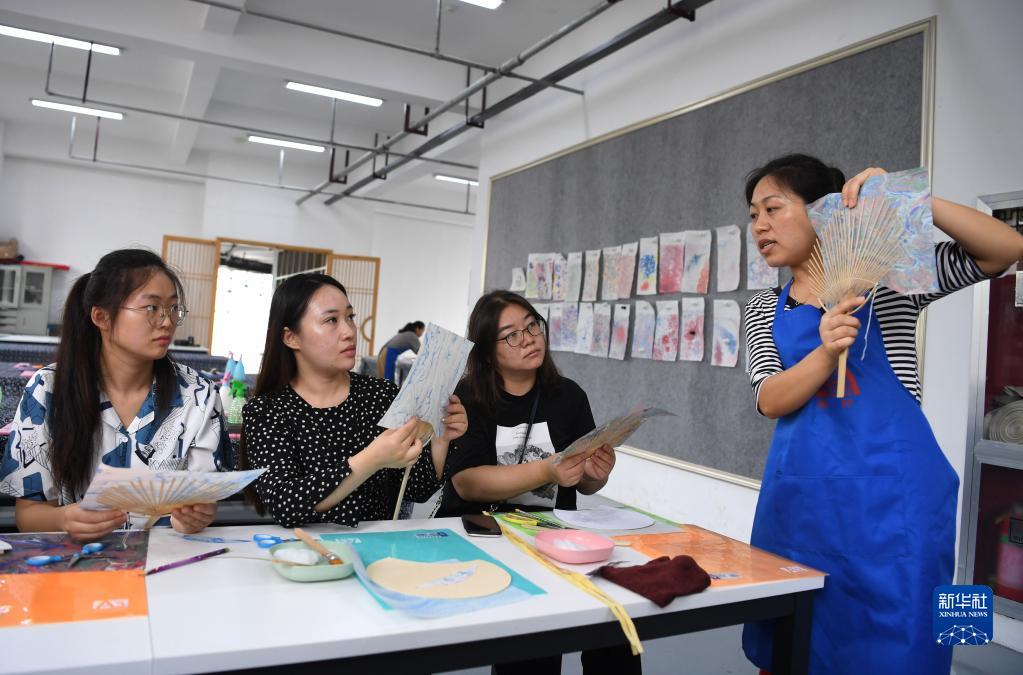 9月8日,在紙箋加工技藝傳習基地,愛(ài)好者體驗用流沙箋制作扇面。