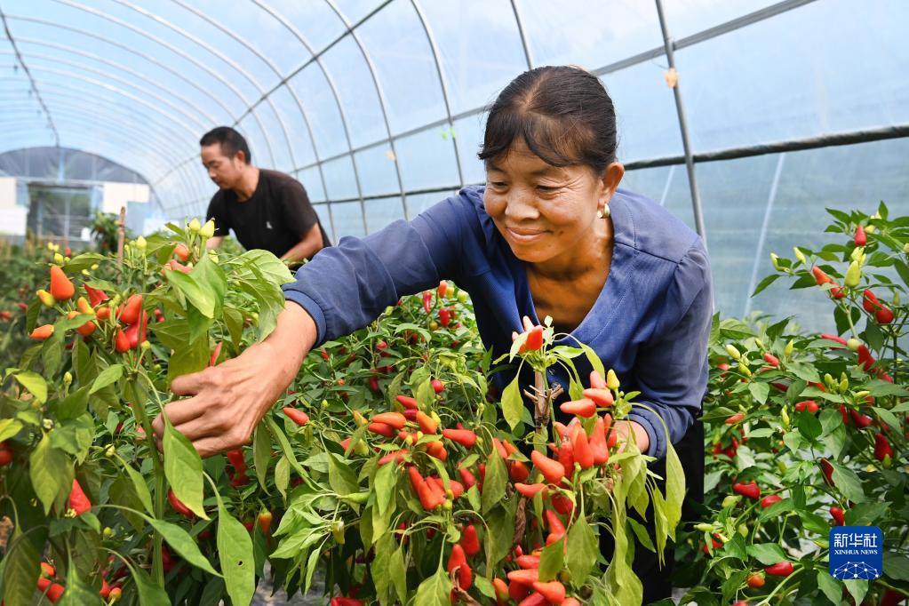 9月7日,陜西漢江之源農業(yè)開(kāi)發(fā)有限公司員工在采摘大棚辣椒。