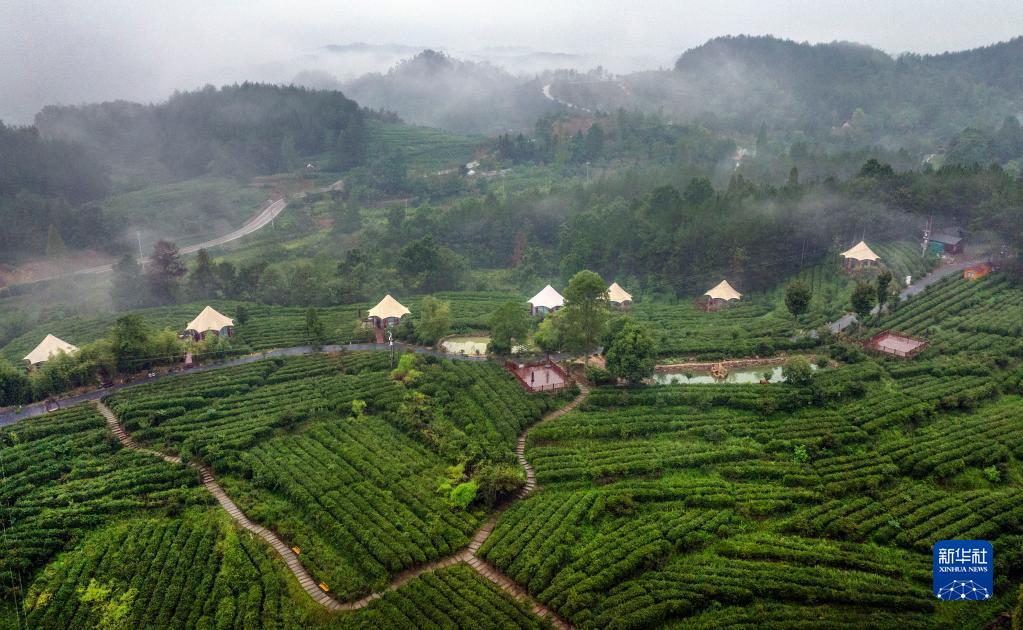 9月8日拍攝的云霧繚繞的寧強縣千山茶園景色(無(wú)人機照片)。