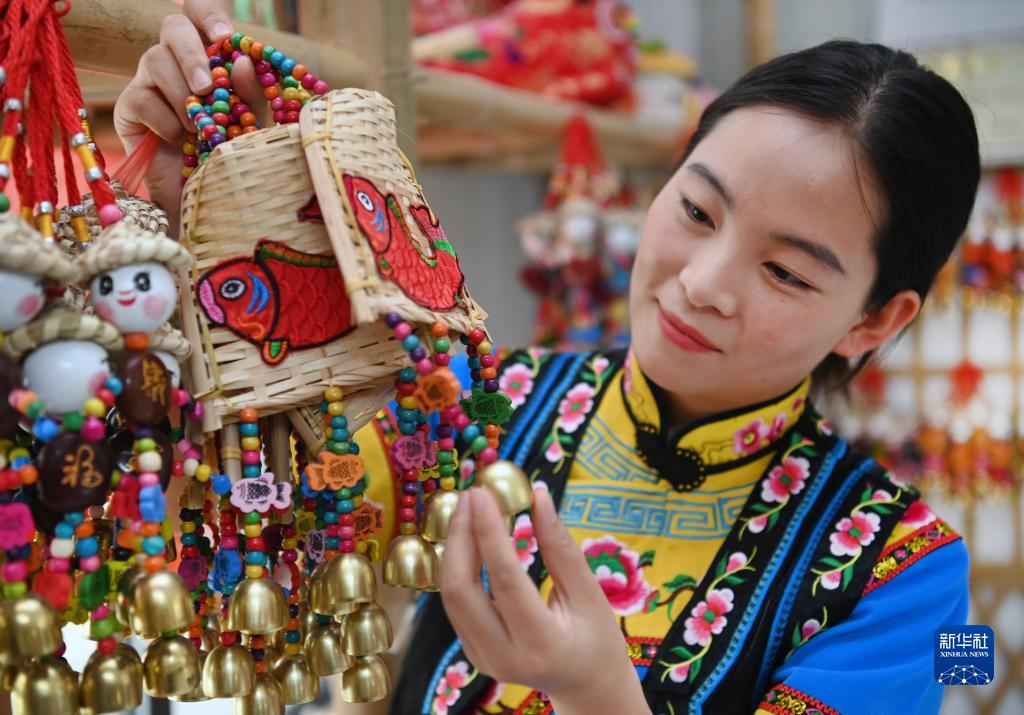 9月7日,年輕人在羌族文化博覽園展銷(xiāo)廳觀(guān)看羌編工藝品。寧強縣以“公司+合作社+基地+農戶(hù)”的發(fā)展模式吸納當地群眾從事羌編,實(shí)現居家靈活就業(yè)。