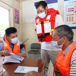 9月8日,上海市公安局閔行分局水上治安派出所民警張怡賓(左一)在“水上平安屋”為船民講解船舶航行安全及反詐騙常識。