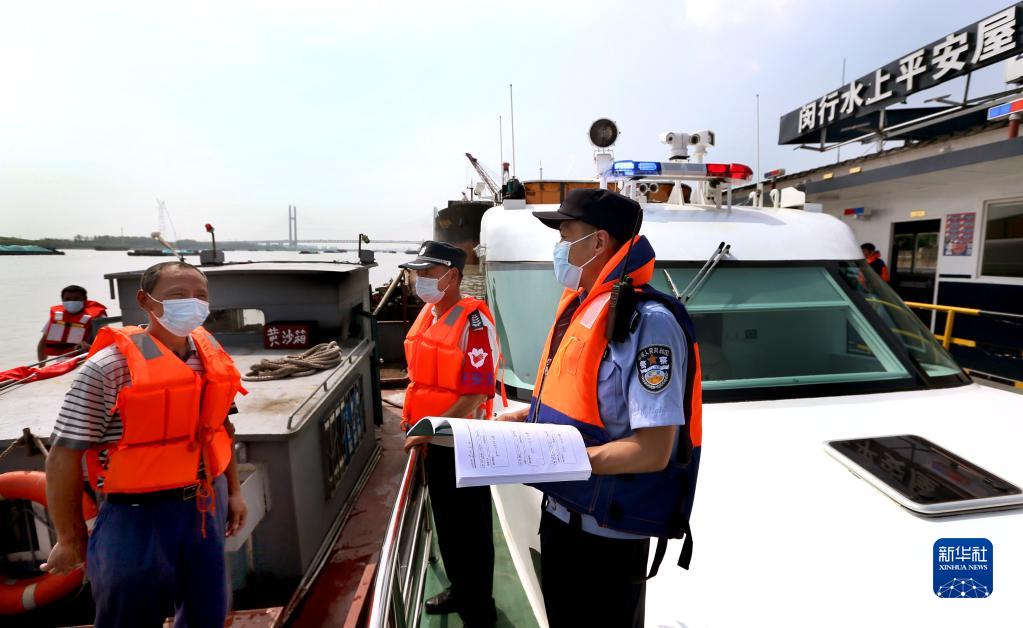 9月8日,上海市公安局閔行分局水上治安派出所民警張怡賓(右一)在“水上平安屋”碼頭接受船民咨詢(xún)。