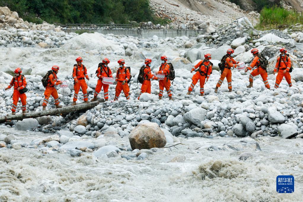 9月8日,在四川省甘孜州瀘定縣磨西鎮附近,救援人員站在臨時(shí)架設的小橋上向河對岸的村民運送生活物資。