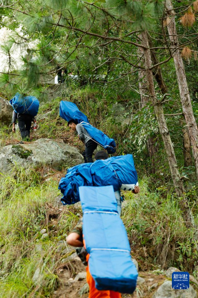 9月8日,在四川省甘孜州瀘定縣磨西鎮附近,救援人員沿著(zhù)臨時(shí)開(kāi)辟的上山小路運送救災帳篷等物資。