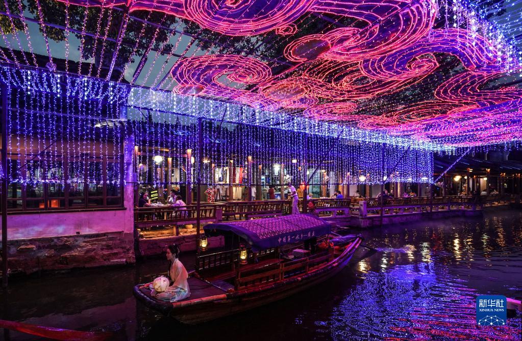 9月8日,一條小船游弋在燈彩裝飾的水巷中。