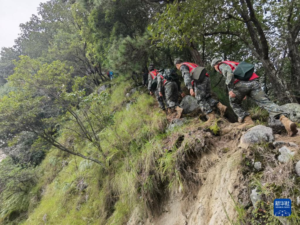 9月7日,武警四川總隊雅安支隊官兵沿著(zhù)山脊開(kāi)辟山路徒步挺進(jìn)瀘定縣磨西鎮共和村(手機照片)。新華社發(fā)(洪福樂(lè ) 攝)