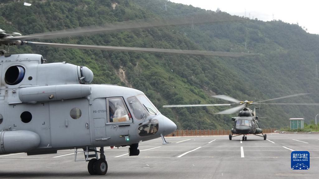 9月6日,西部戰區空軍運輸搜救某團兩架直升機抵達瀘定縣震中區域。新華社發(fā)(劉星宇 攝)
