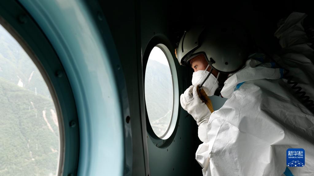 9月6日,西部戰區空軍運輸搜救某團空中救生員在直升機上搜索被困群眾。新華社發(fā)(胡建軍 攝)