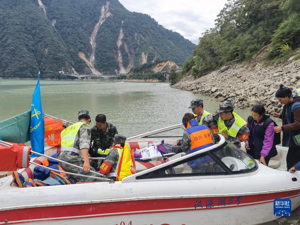 9月7日,漢源縣人武部民兵將王崗坪鄉躍進(jìn)村的受傷老人轉送至水面救援通道(手機照片)。新華社發(fā)