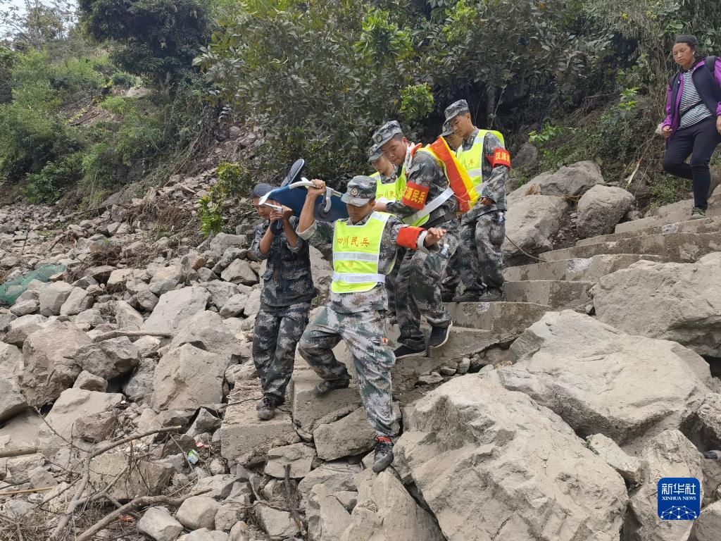 9月7日,漢源縣人武部民兵將受傷老人轉移出王崗坪鄉躍進(jìn)村(手機照片)。新華社發(fā)