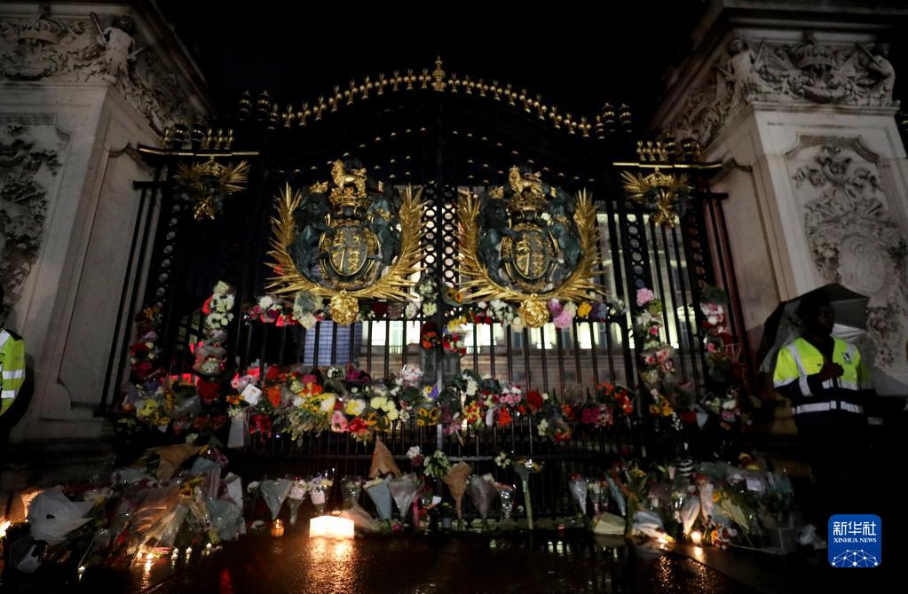 這是9月8日在英國倫敦的白金漢宮外拍攝的鮮花和蠟燭。