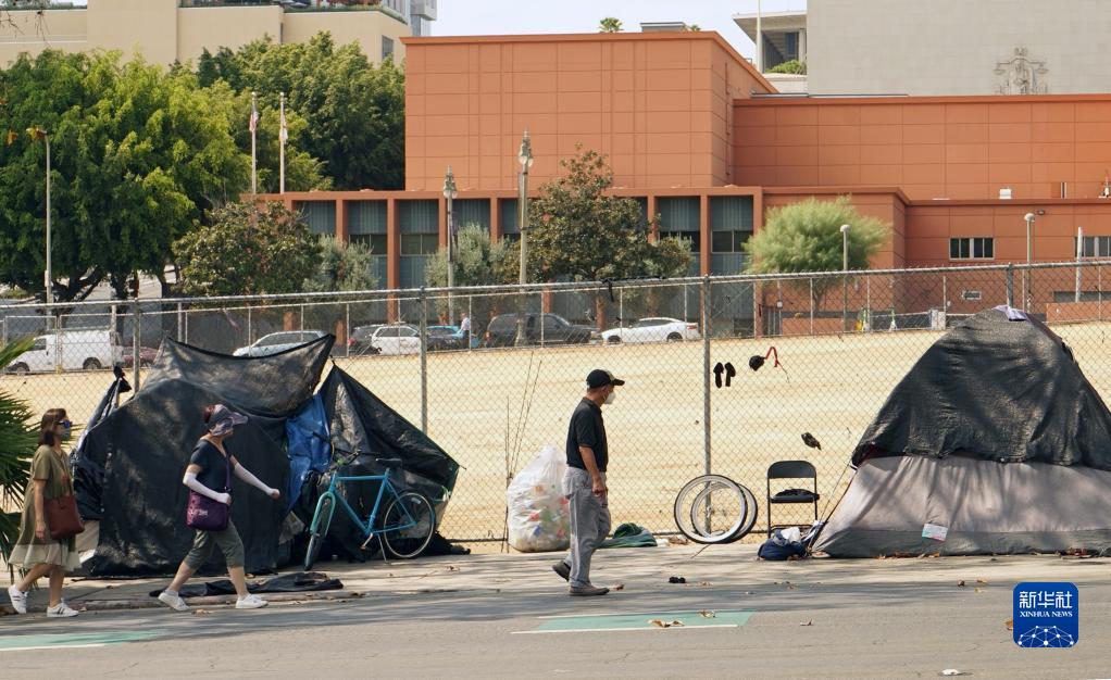 9月8日,人們在美國加利福尼亞州洛杉磯市區經(jīng)過(guò)無(wú)家可歸者的帳篷。