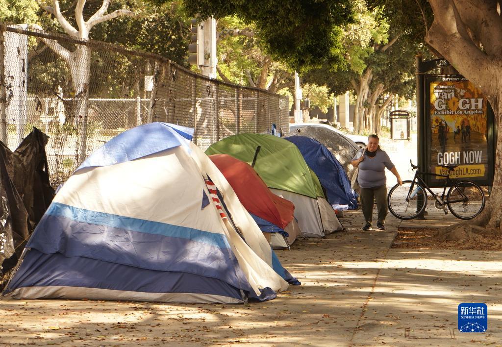 9月8日,行人在美國加利福尼亞州洛杉磯市區經(jīng)過(guò)無(wú)家可歸者的帳篷。