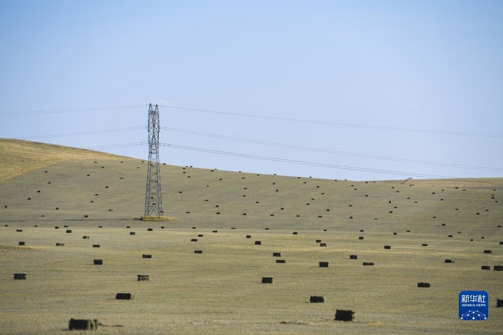 錫林郭勒盟阿巴嘎旗的一處草原上點(diǎn)綴著(zhù)打成捆的牧草(9月8日攝)。