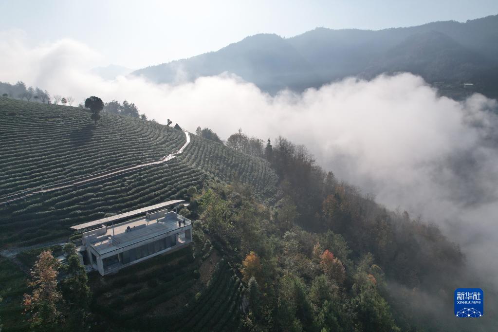 安康市紫陽(yáng)縣向陽(yáng)鎮營(yíng)梁村茶山景色(2021年11月24日攝,無(wú)人機照片)。漢江流過(guò)的紫陽(yáng)縣茶園面積達25萬(wàn)畝。