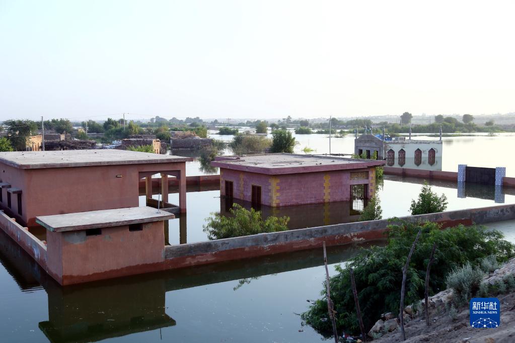 這是9月8日在巴基斯坦信德省拍攝的被洪水浸泡的房屋。