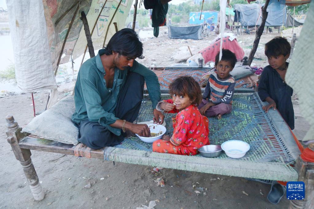 9月8日,在巴基斯坦信德省,受洪災影響的人們在臨時(shí)帳篷中休息。