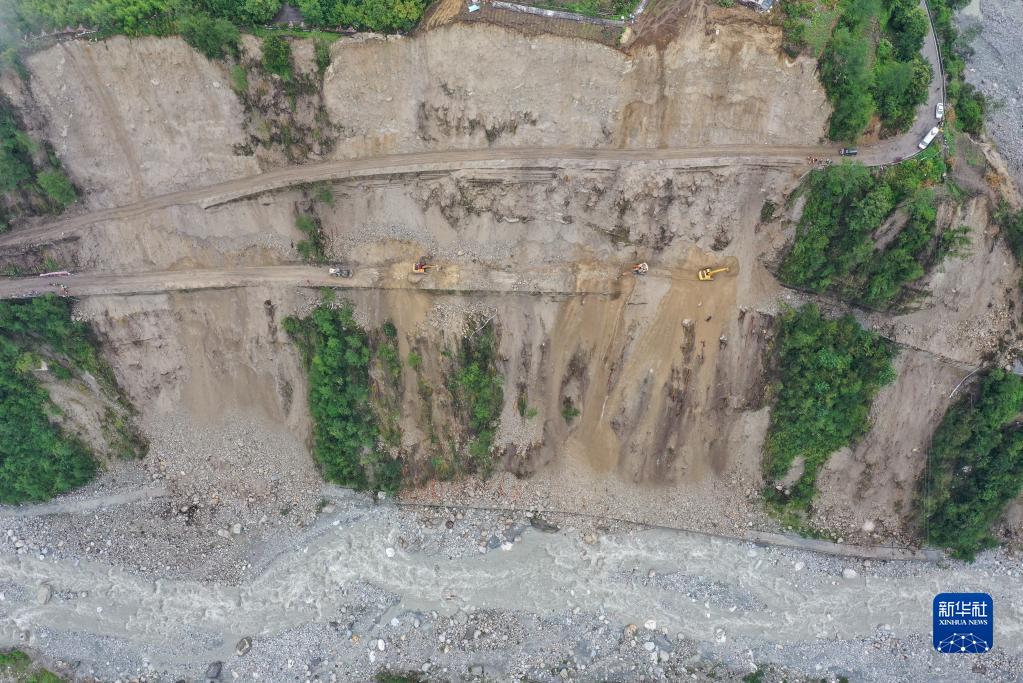 9月9日,搶險人員在搶通磨西鎮附近道路(無(wú)人機照片)。