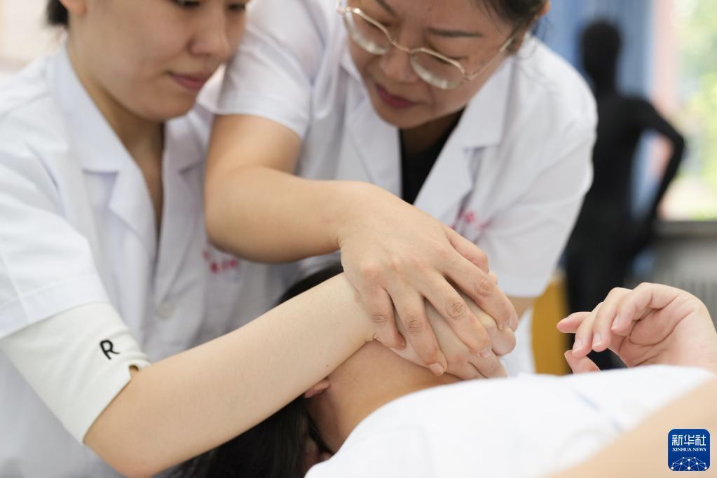 推拿按摩課程實(shí)踐性強,尤其對視障學(xué)生來(lái)說(shuō),“眼睛看不到,需要我們手把手一個(gè)個(gè)教”。每次上課張琳都要握著(zhù)學(xué)生的手,一遍遍帶他們感受手法形態(tài)、力度,觸摸骨骼、肌肉。