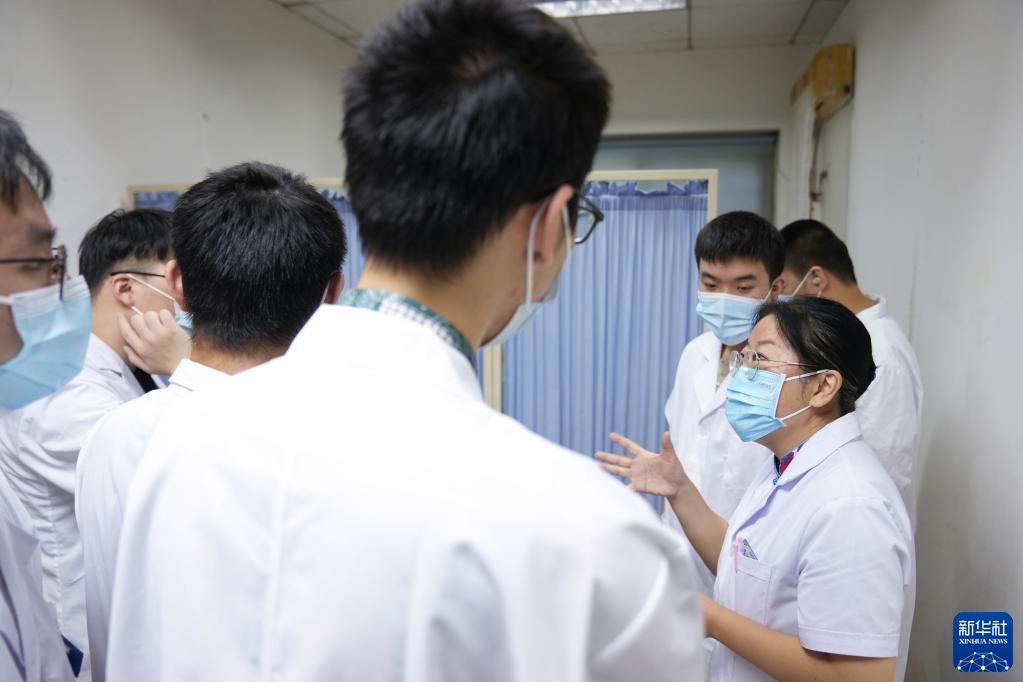 在北京鼓樓中醫醫院(南院區),張琳(前右)為實(shí)習的大學(xué)生講解實(shí)際操作注意事項(9月7日攝)。