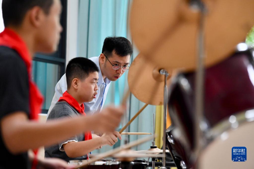 福州市星語(yǔ)學(xué)校教師黃燦在指導學(xué)生敲架子鼓(9月7日攝)。