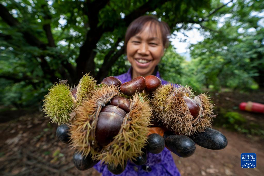 9月9日,在祿豐市中村鄉河西村,農民展示采收的板栗。