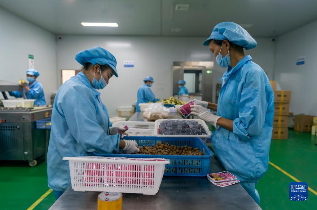 9月9日,在祿豐市中村鄉一家板栗加工企業(yè),工作人員將板栗裝袋。