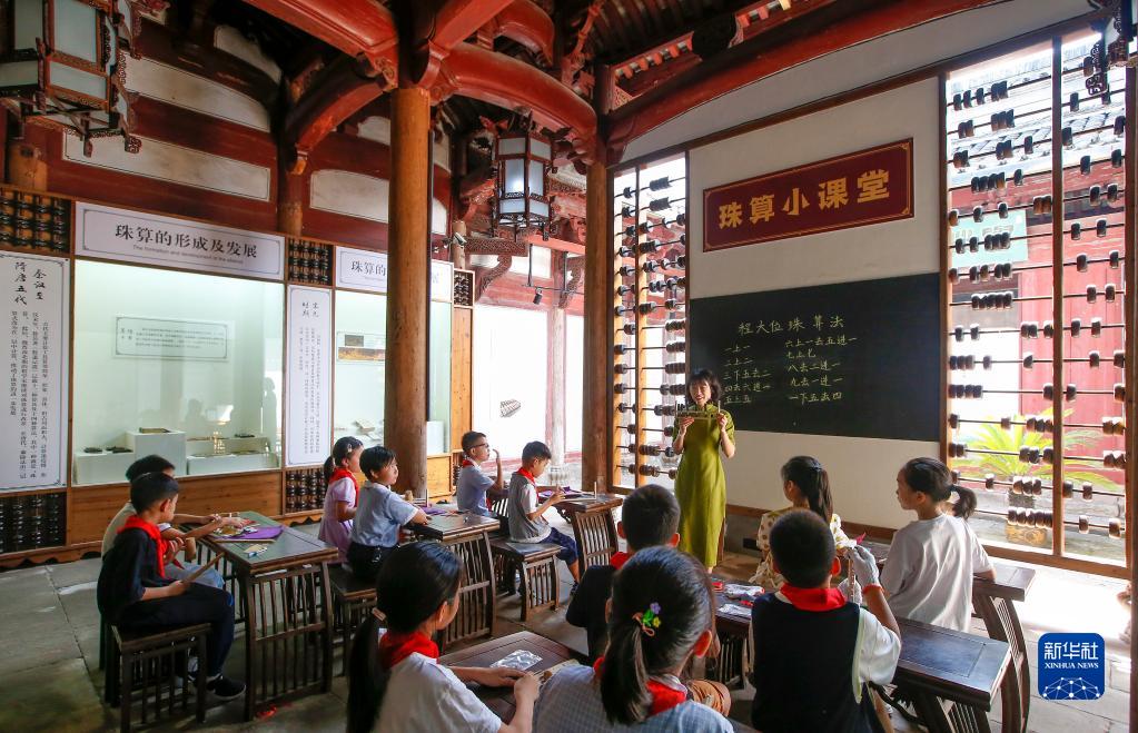 9月7日,在安徽省黃山市程大位博物館,汪素秋在公益珠算小課堂上帶領(lǐng)孩子們制作算盤(pán),培養孩子們對珠算的興趣。