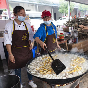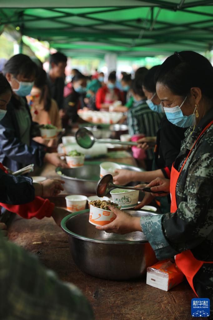 9月9日,在石棉縣王崗坪鄉安置點(diǎn),受災群眾和志愿者在發(fā)放午飯。