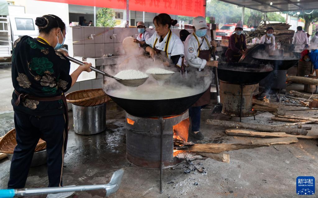 9月9日,在石棉縣新民鄉海耳村臨時(shí)安置點(diǎn),村民志愿者在做飯。