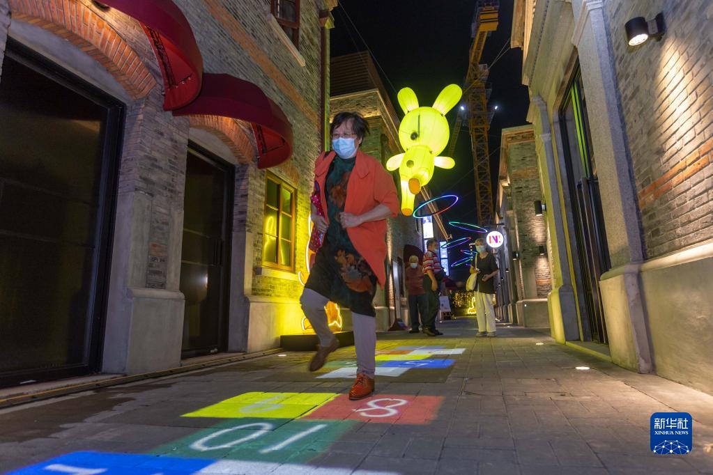 9月9日,市民在“今潮8弄”中秋燈會(huì )體驗跳房子游戲。