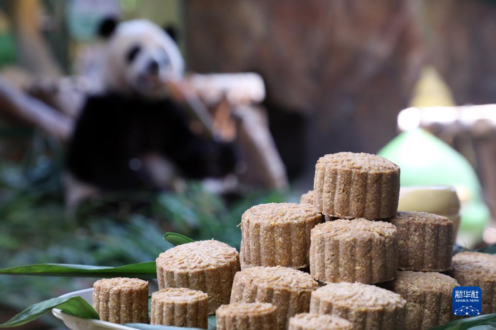中秋節前夕,廣州長(cháng)隆野生動(dòng)物世界工作人員為大熊貓三胞胎“萌萌”“帥帥”“酷酷”準備了特制的“月餅”。大熊貓“月餅”的食材包括竹筍、水果等大熊貓喜愛(ài)的食物。