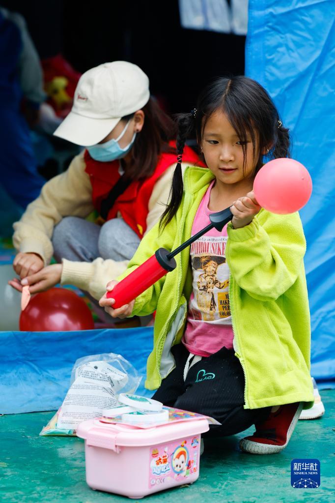 9月10日,在瀘定二中臨時(shí)安置點(diǎn),一名來(lái)自得妥鎮的小朋友在幫志愿者打氣球。