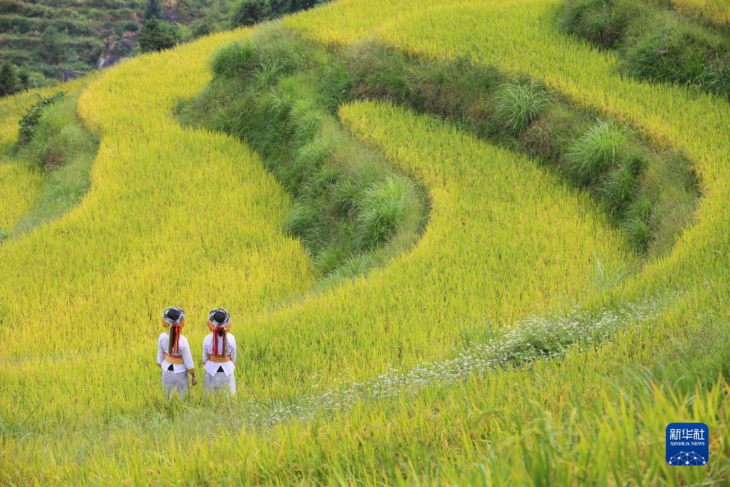 9月10日,游客身著(zhù)花瑤服飾在湖南省懷化市溆浦縣葛竹坪鎮山背梯田中游玩。