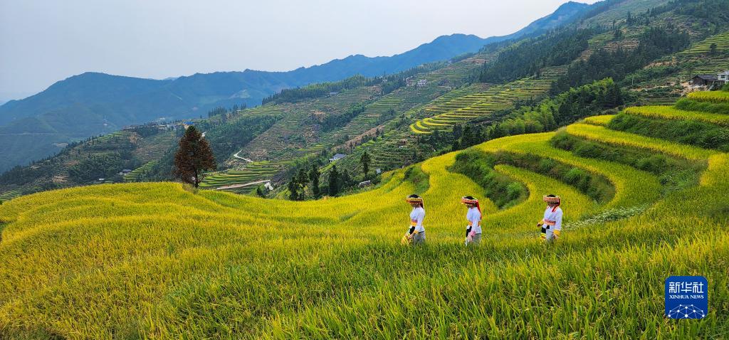 9月10日,游客身著(zhù)花瑤服飾在湖南省懷化市溆浦縣葛竹坪鎮山背梯田中游玩。