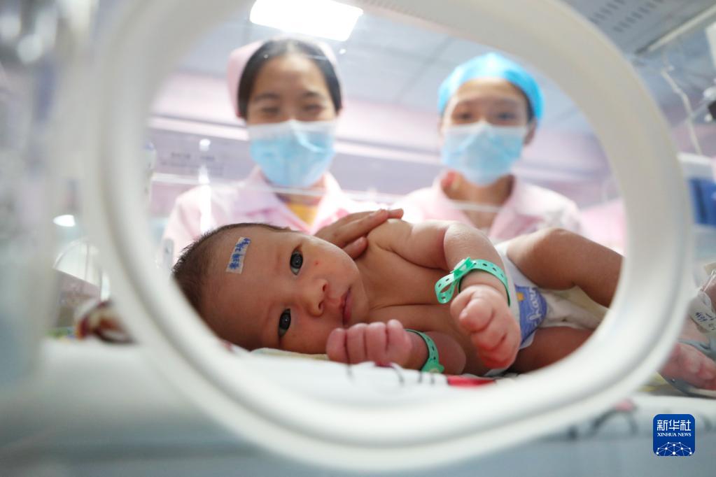 9月10日,在湖南永州市新田縣人民醫院新生兒科,醫護人員在護理新生兒。