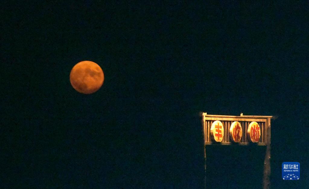 9月10日在河北省遵化市一處稻田畫(huà)景區拍攝的圓月。