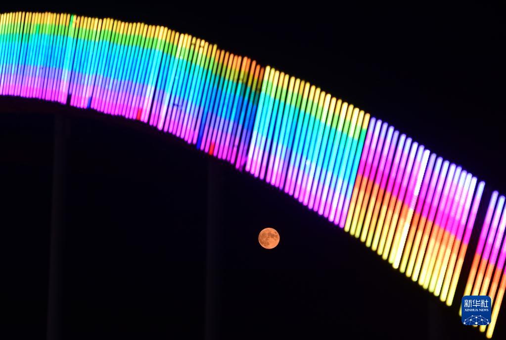 9月10日在河北滄州京杭大運河彩虹橋上拍攝的月亮。