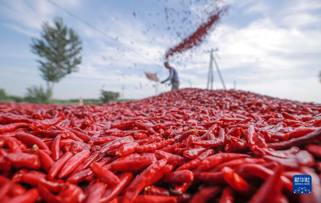 9月8日,河北省玉田縣亮甲店鎮農民在場(chǎng)院晾曬辣椒。