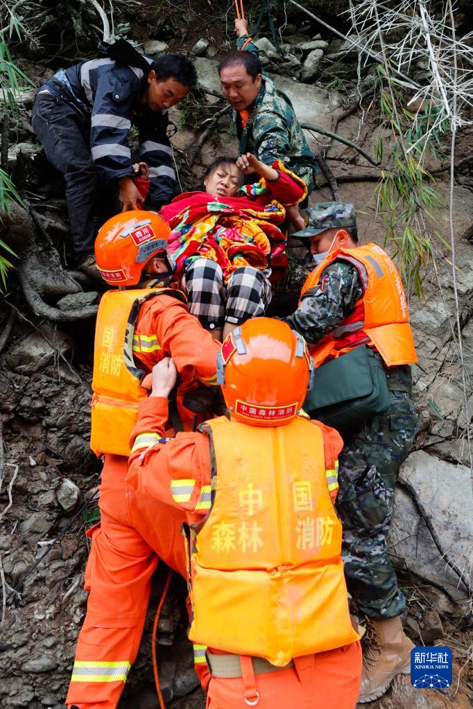 9月6日,救援人員合力將一名從四川省甘孜州瀘定縣得妥鎮灣東村疏散出來(lái)的受傷村民抬下山。