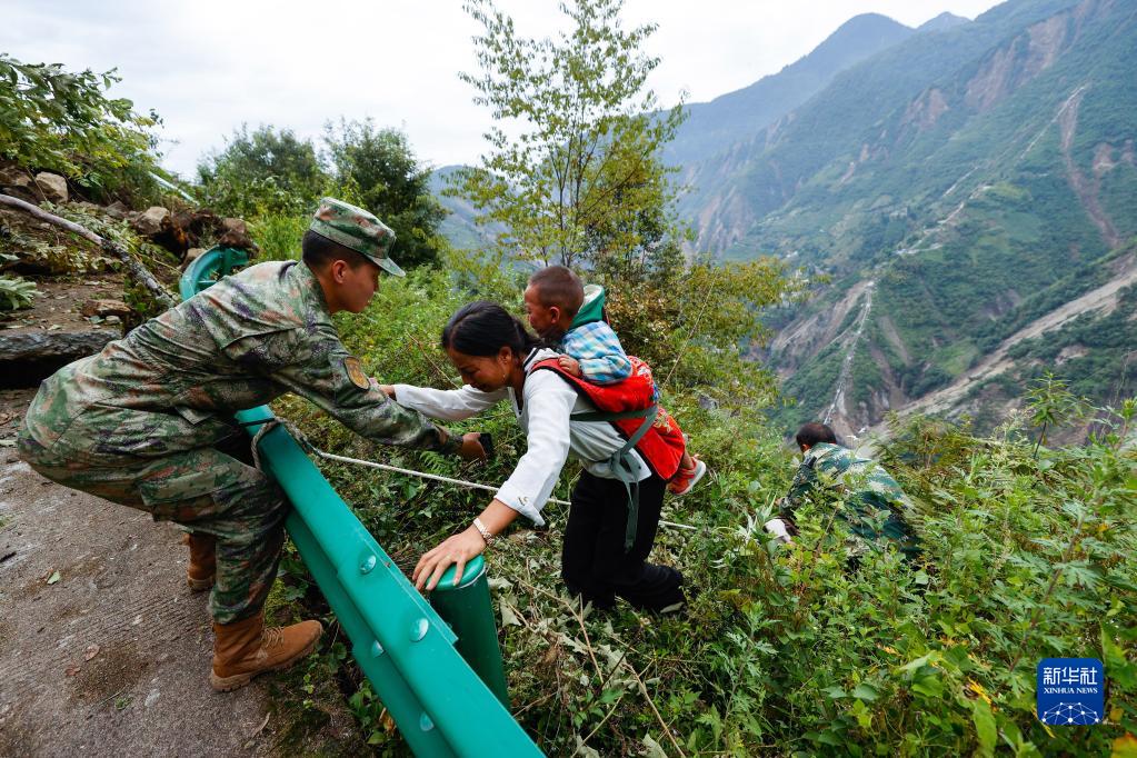 9月6日,救援人員幫助四川省甘孜州瀘定縣得妥鎮灣東村村民攀爬高山向外疏散。