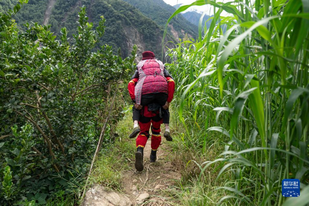 9月10日,在四川省石棉縣王崗坪彝族藏族鄉幸福村,救援人員在轉運患病老人。