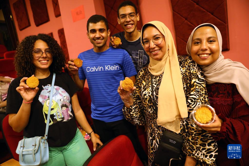 9月8日,在埃及開(kāi)羅,來(lái)自埃及各高校的學(xué)生手拿月餅拍照。