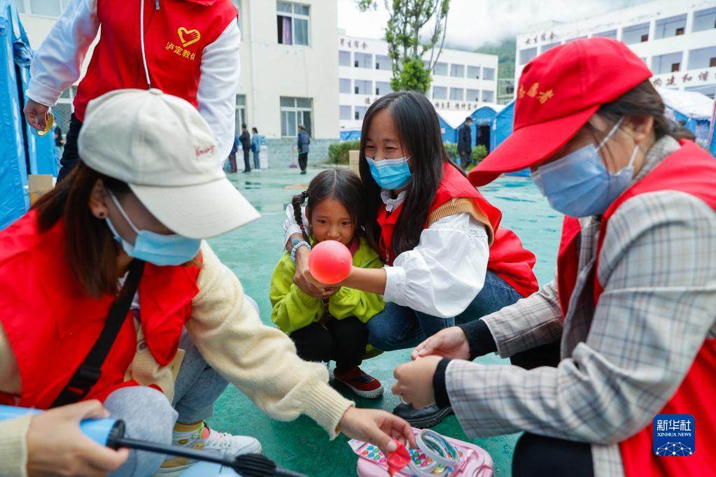 9月10日,在四川省甘孜州瀘定縣第二中學(xué)校地震災后臨時(shí)安置點(diǎn),羅蓮(右二)帶著(zhù)來(lái)自地震重災區得妥鎮的孩子一起吹氣球。